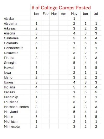 College camps get posted at randoms times throughout the year. These camps are listed at the discretion of each college that is hosting any camp.